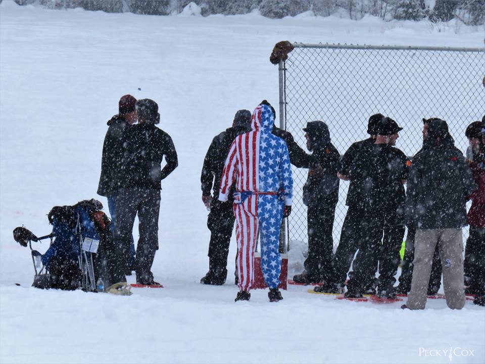 Huckleberries isn’t sure who snapped this photo of a Priest Lake Snowshoe Softball game last Saturday. But it was on Pecky Cox’s Priest Lake Facebook page. Obviously, one player is more patriotic than the rest.
