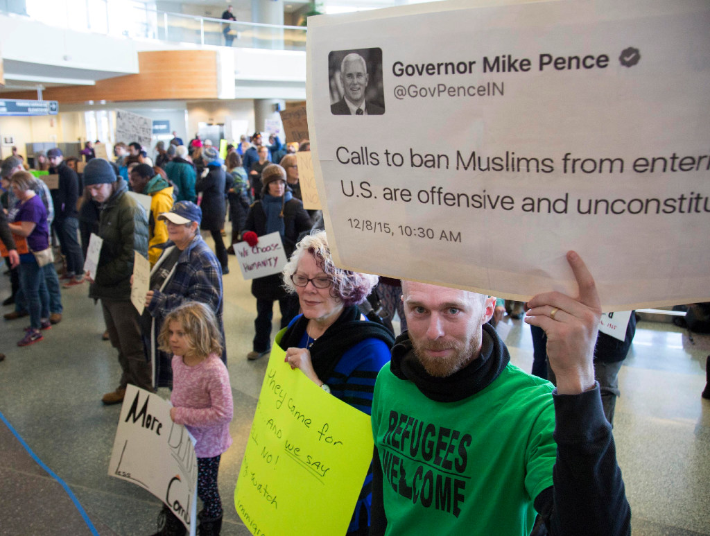 Andrew Lynes, 29, of Boise, joins a group of over 600 people protesting President Trump’s travel ban on refugees and citizens of seven Muslim-majority nations, at the Boise Airport in Boise on Sunday. Lynes said he works with a social work agency that helps multicultural populations in Boise, including refugees who have fled violence, famine and war in their own countries. (Darin Oswald/Idaho Statesman via AP)