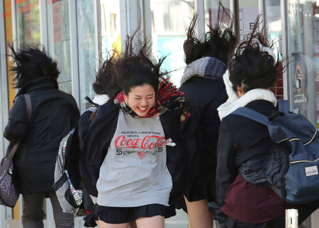 A girl smiles as her hair is blown by strong wind in the Chinatown area in Yokohama, near Tokyo, Friday. You write the cutline. (AP Photo/Koji Sasahara)