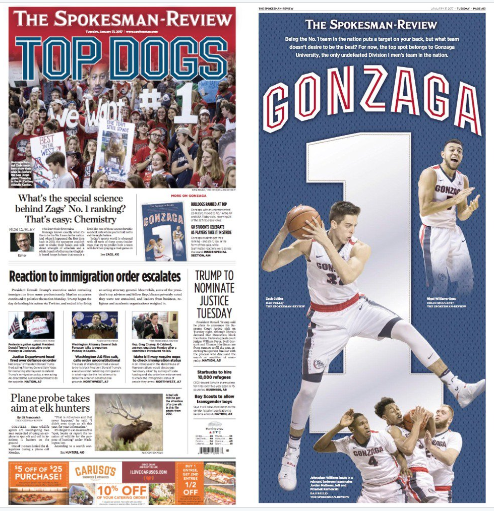 If you’re a ha-huge college basketball fan, and you love the Gonzaga Bulldogs, you can’t find better coverage of them that in the pages of The Spokesman-Review. And I’m not saying this just because I get my paychecks from the SR. Under new Editor Rob Curley, the SR has been all in on the Bulldogs since the beginning of the season. Complete game coverage, features, columns, sidebars, special sections. All you to do is look at the front page and special section page of today’s coverage of the Bulldogs ascending to No. 1 in the nation again.