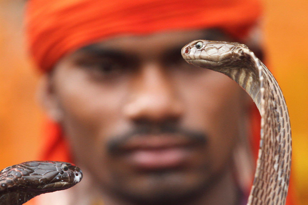 A man displays snakes to attract alms from Hindu devotees who arrive to worship at a temple during the annual Nag Panchami festival, in Allahabad, India, Friday. The festival is dedicated to the worship of snakes. You write the cutline. (AP Photo/Rajesh Kumar Singh)