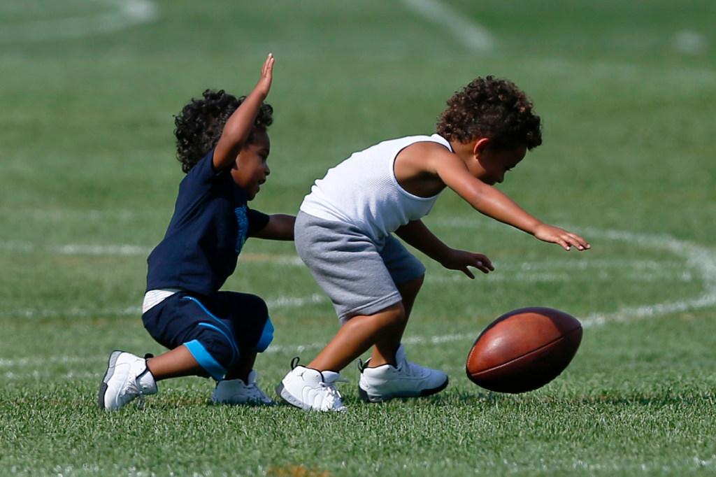 Pittsburgh Steelers wide receiver Antonio Brown’s sons, Ali, left, and Auto, right, play with a football during practice at NFL training camp in Latrobe, Pa., Sunday. (AP Photo/Keith Srakocic)