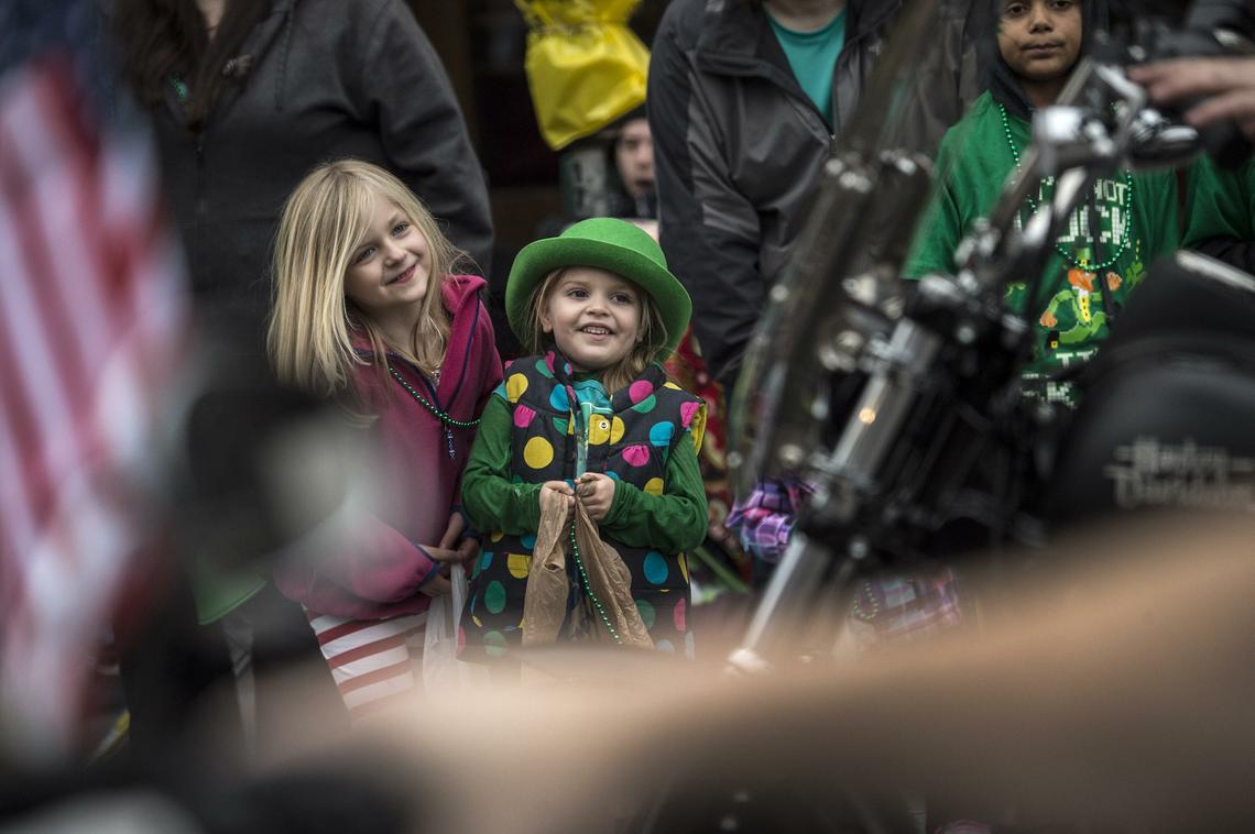 Best friends Ella Doering, 5, left, and Annalee Geense,4, smile for the marchers during the St. Patrick’s Day Parade in Spokane on Saturday. Photo package here. (Kathy Plonka/SR photo)