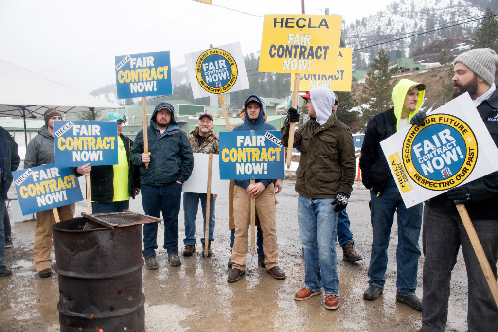 Miners stand on the picket lines across from the Lucky Friday mine in Mullan Monday, the first day of a strike by the miners against Hecla, owner of the Lucky Friday mine. Story here. (Jesse Tinsley/SR photo)