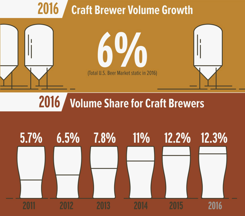 Craft’s share of the total beer market inched up to 12.3 percent from 12.2 percent in 2015, by volume. (By dollars, it’s higher – 21.9 percent – because craft beer costs more.)