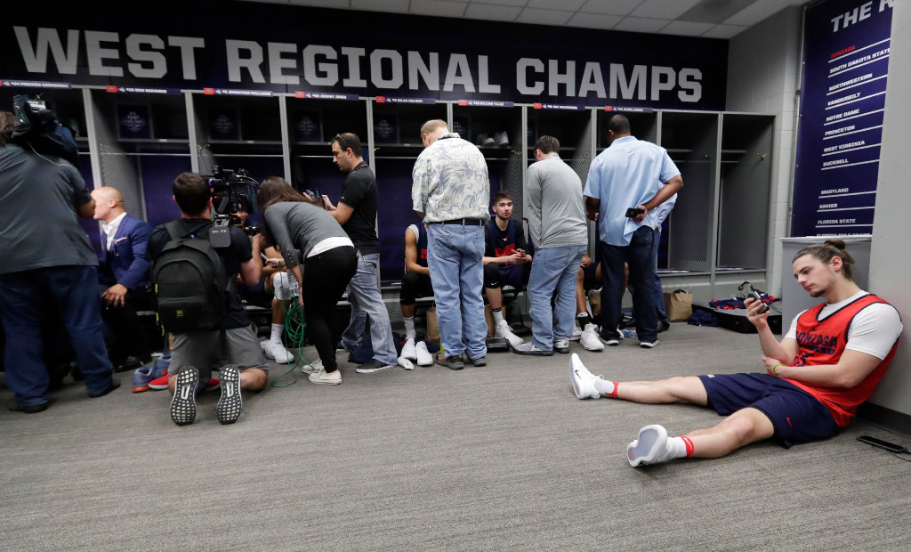Gonzaga’s Rem Bakamus looks at his phone as teammates are being interviewed in their locker room after a practice session for their NCAA Final Four tournament college basketball semifinal game Thursday in Glendale, Ariz. (AP Photo/Matt York)