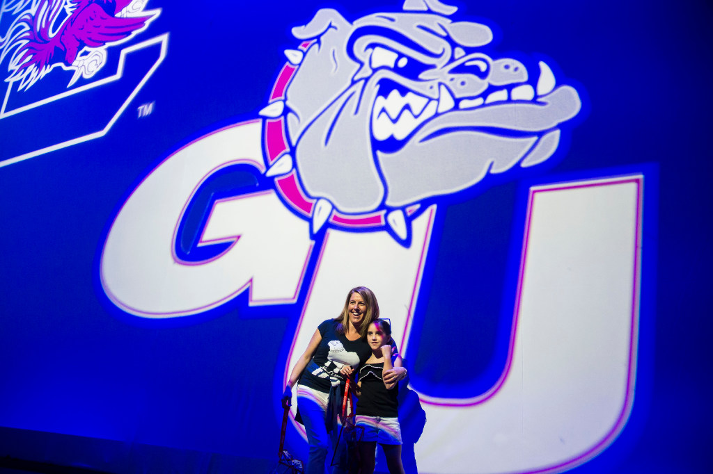 Karen Weber and her daughter Ellie, 9, from Spokane, have their photo taken in front of a giant Gonzaga University logo at the entrance of the NCAA Final Four Fan Fest in the Phoenix Convention Center Friday. (Colin Mulvany/SR photo)