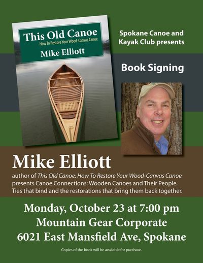 PADDLING – Mike Elliott, author of “This Old Canoe: How To Restore Your Wood-Canvas Canoe,” will present a free program on wooden canoes, 7 p.m., tonight, Oct. 23, at Mountain Gear Corporate Headquarters, 6021 E. Mansfield in Spokane Valley, sponsored by the Spokane Canoe & Kayak Club .