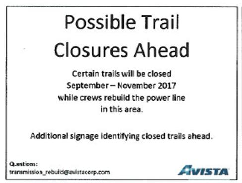 TRAILS — Some South Hill bluff trails will be temporarily closed off and on during the next two months as Avista uses vehicles and occasionally a helicopter to replace 2.7 miles of transmission line through the area.
