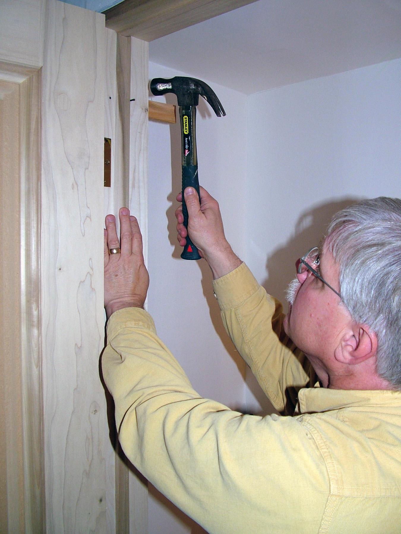Be sure to install the shims behind the door hinges. The most important step after the door is installed is to install a 2.5-inch, or 3-inch, screw in one of the screw holes of the top hinge. This screw needs to penetrate through the door jamb and embed itself into the rough lumber of the wall. This screw ensures the door will not droop over time, causing it to rub against the jamb.