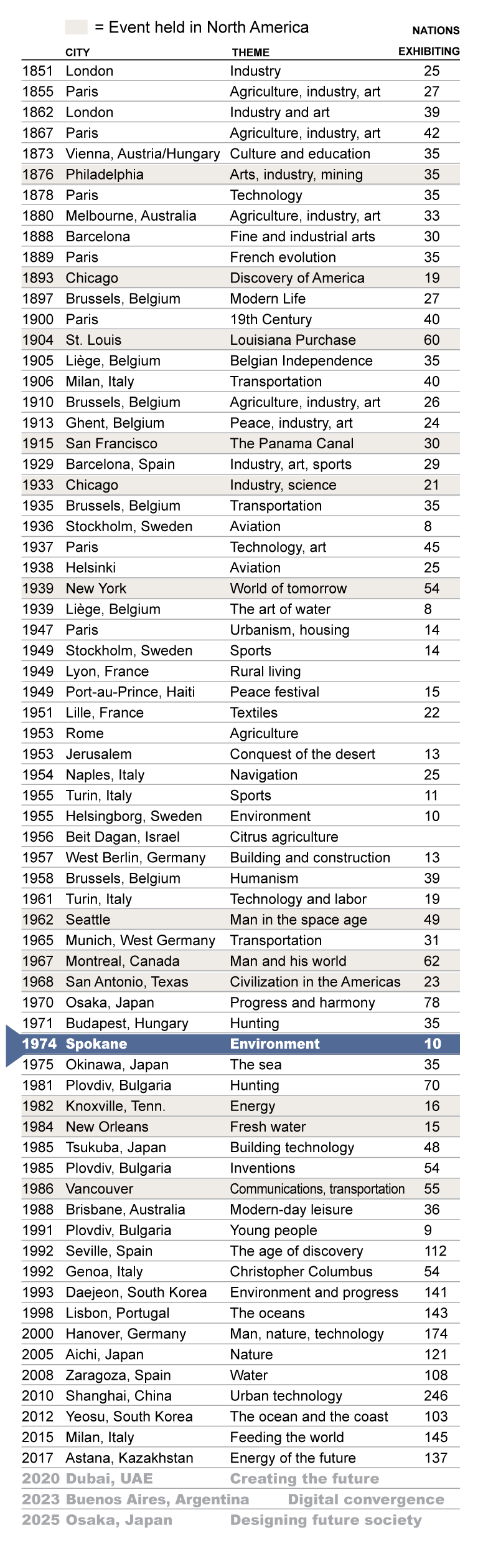 Nearly all world’s fairs have had themes. The theme for Expo ’74 was "Celebrating Tomorrow’s Fresh New Environment." That seemed mighty appropriate given the eyesore that became the fair site: a blighted area with two train depots and an unsightly tangle of railroad tracks.