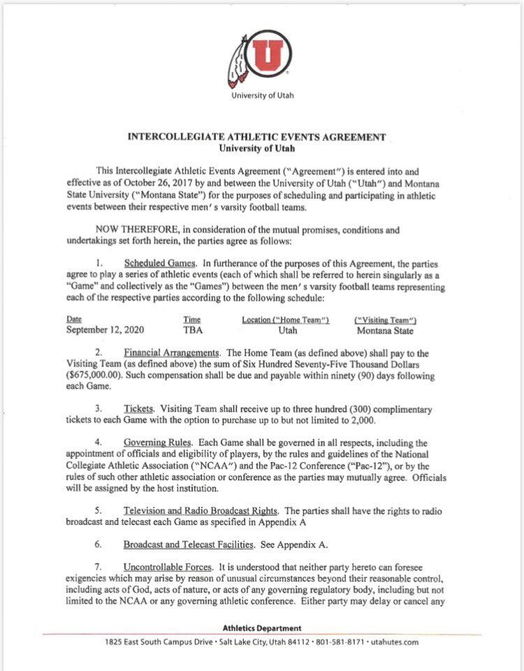 The contract Montana State had with Utah for its since-canceled game showed up on the Internet recently. Included within the section concerning a possible cancellation is a line about a conference decision as the reason for a change. It was sort of a get-out-of-jail-free card for Utah. Such language may not be in every contract, but it would seem to indemnify Pac-12 members from liability, as the conference made the choice to play a conference-only schedule this year.