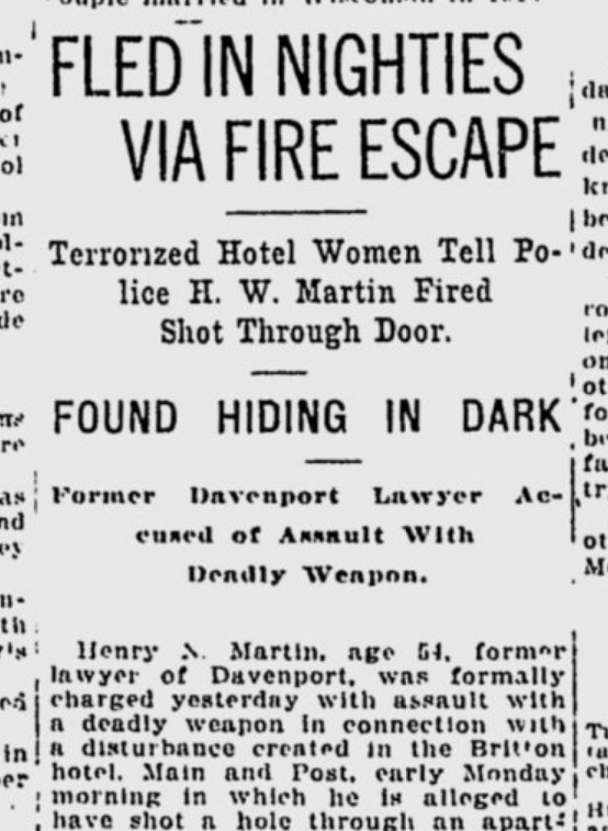 Terrified residents of the Britton Hotel fled in their “nighties” via the fire escape after Henry N. Martin, 54, a former Davenport lawyer, fired gunshots into their room.