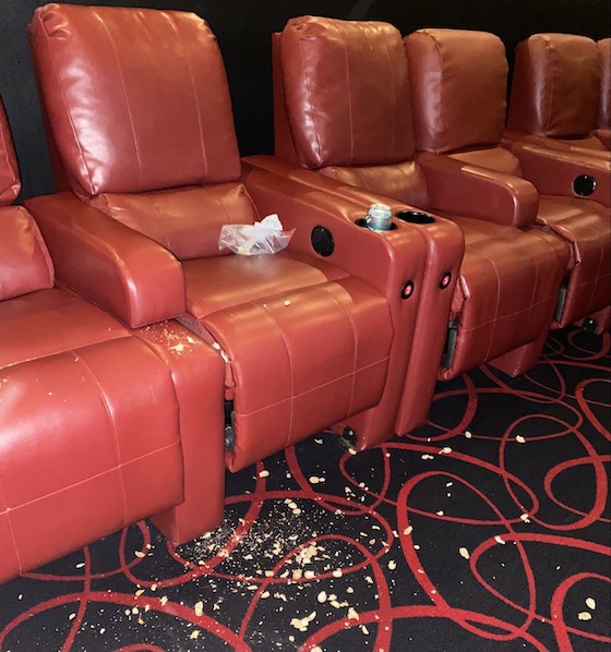 We saw only the signs of the other moviegoer – I don’t recall the person’s gender – when we left: a mass of peanut shells littered on the floor, other garbage left strewn both on the seat and stuffed into the seat’s drink well.
