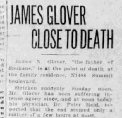 From the pioneer beat: James N. Glover, known as the “Father of Spokane,” suffered an “acute attack” of an unspecified medical nature a day earlier.