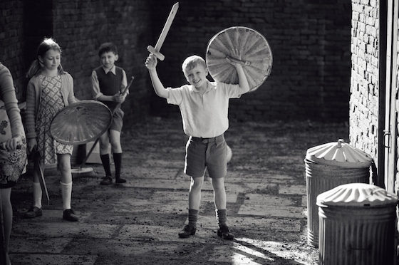Beginning with a panoramic overview of Belfast today, captured in living color, Branagh’s movie quickly turns back the clock, rendering the year 1969 in tones of black and white. Our focus is on one particular block, where Protestants and Catholics live in mixed company – and the only violence being performed, at first, is that by a wooden sword-wielding boy named Buddy (played by newcomer Jude Hill ).