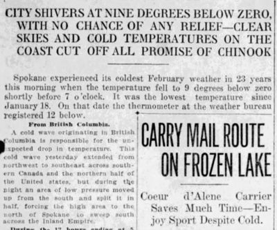 For the first time in history, the patrons of Lake Coeur d’Alene’s marine postal route received their mail not by boat, but by ice skate. The skating mail carrier said he completed his route in about one-third of the time it takes him to cover it by boat.
