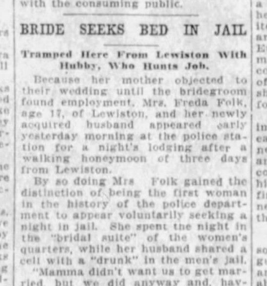 Mrs. Freda Folk, 17, of Lewiston “achieved the distinction of being the first woman in the history of the (Spokane) police department to appear voluntarily seeking a night in jail.”