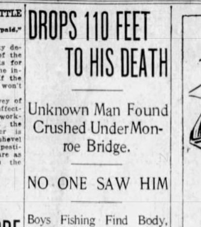 It turned out to be an unidentified man who had apparently plunged from the railing of the Monroe Street Bridge, 110 feet above.