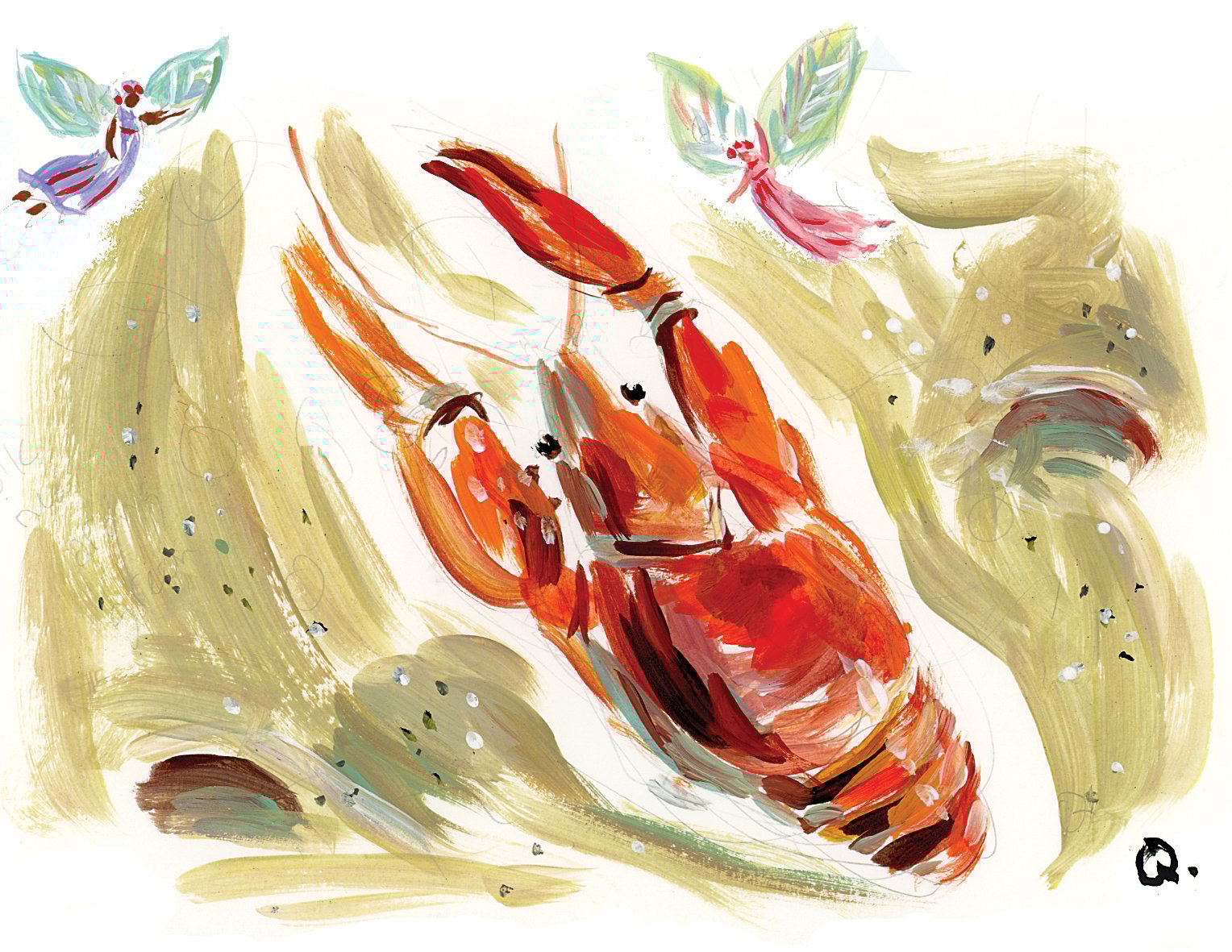 The cousins walk along the shore to see what the tide drifted in from the night. They gasp and their eyes widen as they see dead crawdads.
