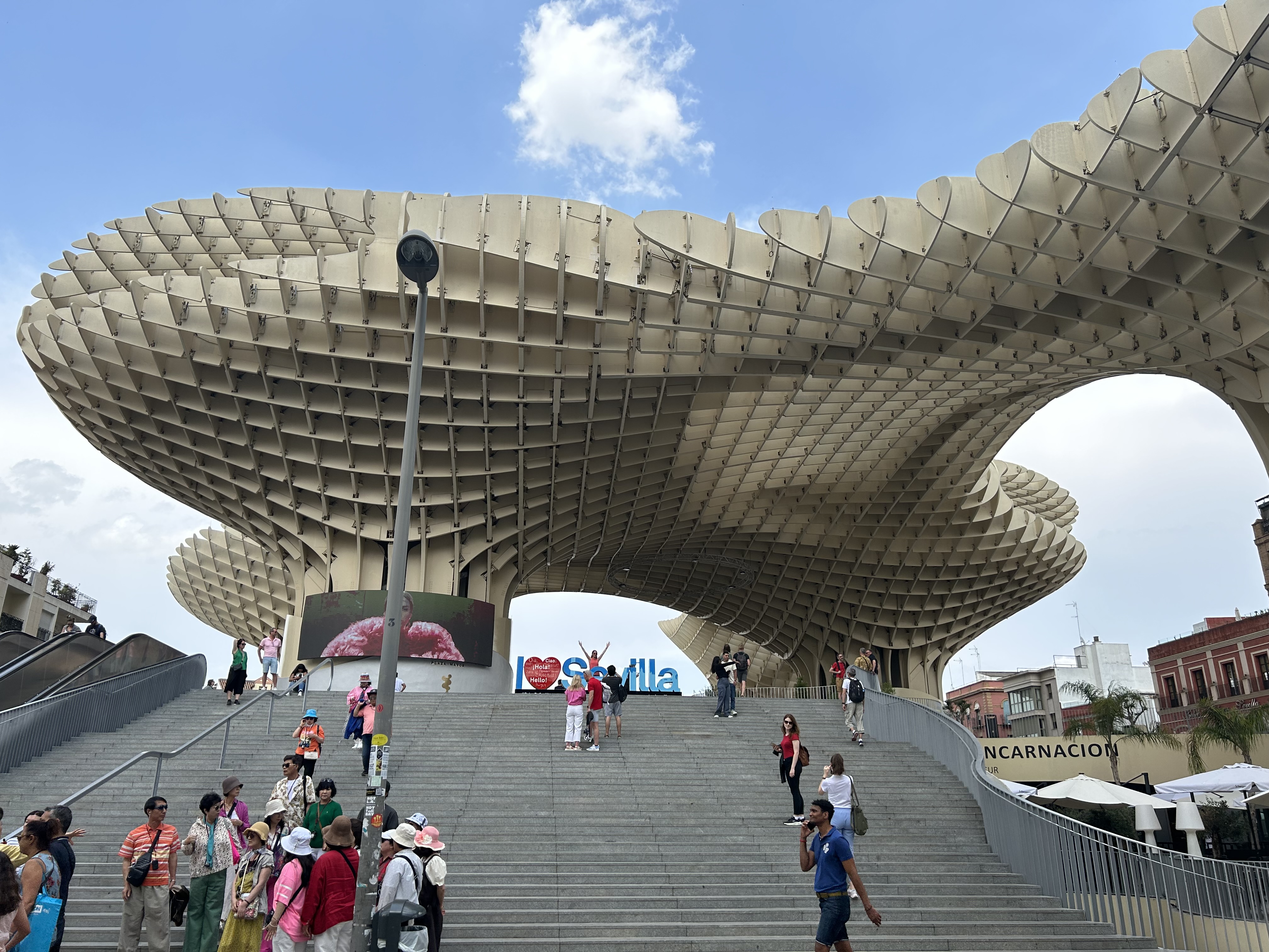 And I’m glad that we did. Because in the midst of all of Sevilla’s ancient splendor, Las Setas – which is also known as the Metropol Parasol – stands out. Designed by the German architect Jūrgen Mayer , it’s a massive, mostly wooden structure shaped like a mushroom (or bunch of mushrooms) that sits in Plaza Encarnación and houses a market, restaurants, a basement museum and a rooftop terrace from which you can see the whole city.