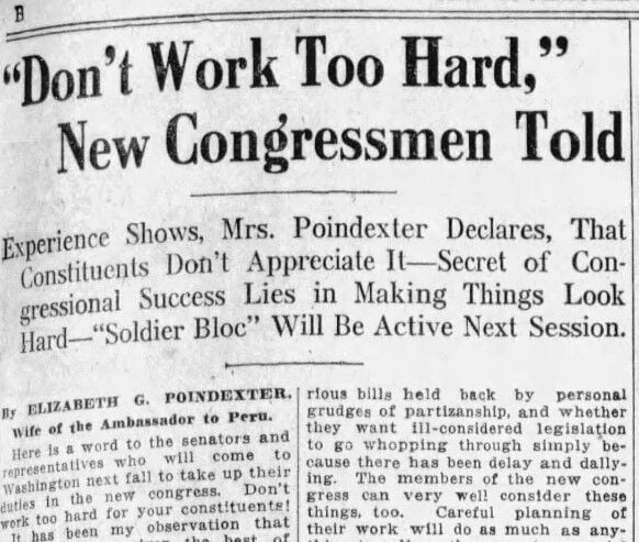 Elizabeth Gale Poindexter, wife of former U.S. Senator Miles Poindexter of Spokane, served up this unexpected bit of advice for new Congress members: “Don’t work too hard for your constituents!”