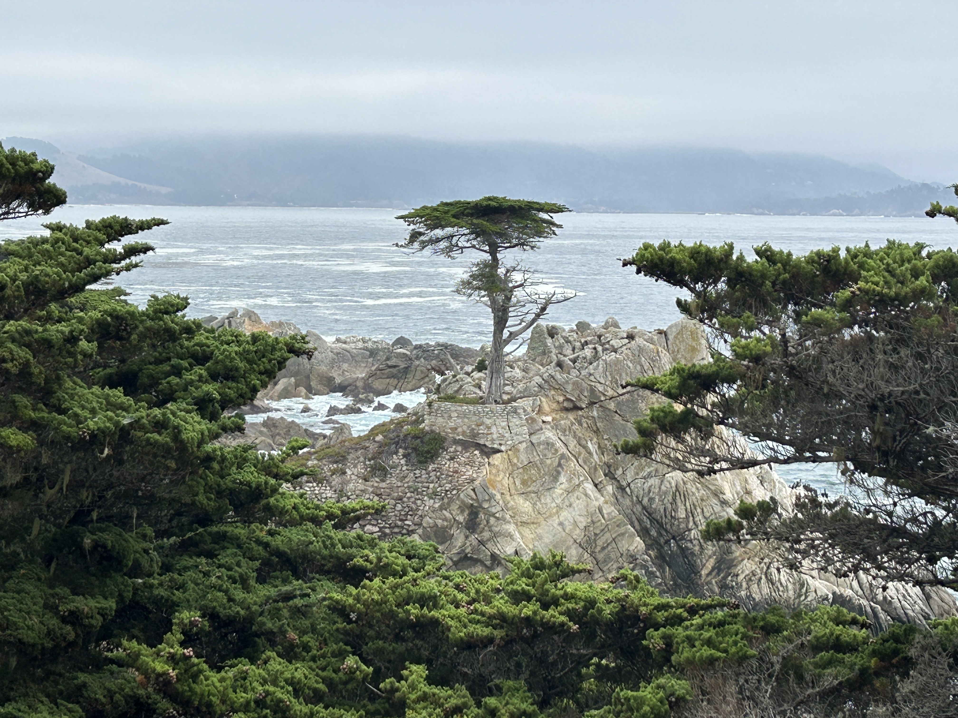 And, true enough, the lack of sun didn’t stop any of us from taking photos. It’s just that none of the ones we took showed the bright blue sky that we’d hoped for. Which would have been the perfect backdrop to our view of the Ghost Trees of Pescadero Point and the “mysterious natural wonder” known as the Lone Cypress , not to mention the Cypress Point Lookout, Seal Rock and Spanish Bay Beach.