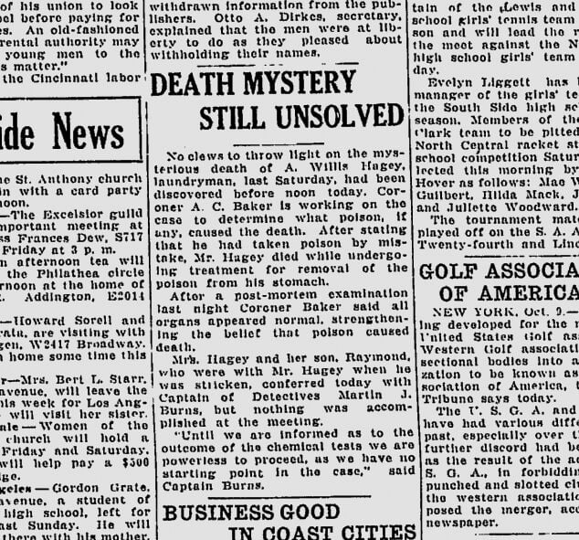 Preliminary lab tests indicated that the wine bottle had traces of an alkaloid, probably strychnine. Hagey’s son, Raymond Hagey, admitted that he had purchased the wine several weeks ago at the Bungalow, a roadhouse west of Ft. George Wright.