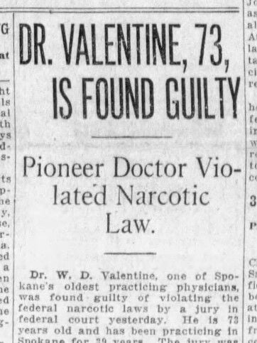 Dr. W.D. Valentine, 73, one of “Spokane’s oldest practicing physicians,” was convicted of two counts of violating federal narcotics laws when he sold morphine to a local addict.