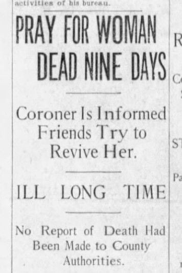 A doctor who had been treating her inquired about her health a few days earlier, and her friends told him that she was “just doing fine.” Yet when he called a few days later, “he was informed that she had been dead nine days and it had been decided to call a doctor.”