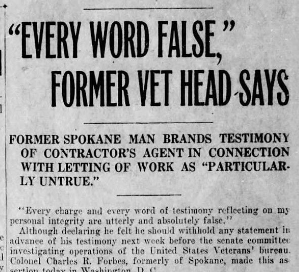 Former Spokane resident Charles R. Forbes, ex-director of the federal Veteran’s Bureau, declared that “every charge and every word of testimony reflecting on my personal integrity are utterly and absolutely false.”
