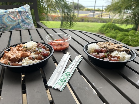 After we finished our round (we don’t keep score, so don’t ask), we looked for a poke place to eat. Poke (pronounced POH-keh) , if you don’t know, refers to “cubes of marinated sushi grade fish which is then tossed over rice and topped with Asian- inspired sauces.” On our last trip to the North Shore of Oahu, my daughter and her family sought out poke in, of all places, a temporary stand set up behind an Ewa Beach 7-Eleven. They weren’t disappointed in the slightest.