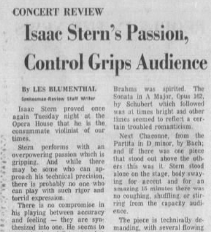 The Spokesman-Review music critic declared that violinist Isaac Stern was, in fact, “the consummate violinist of our time.”