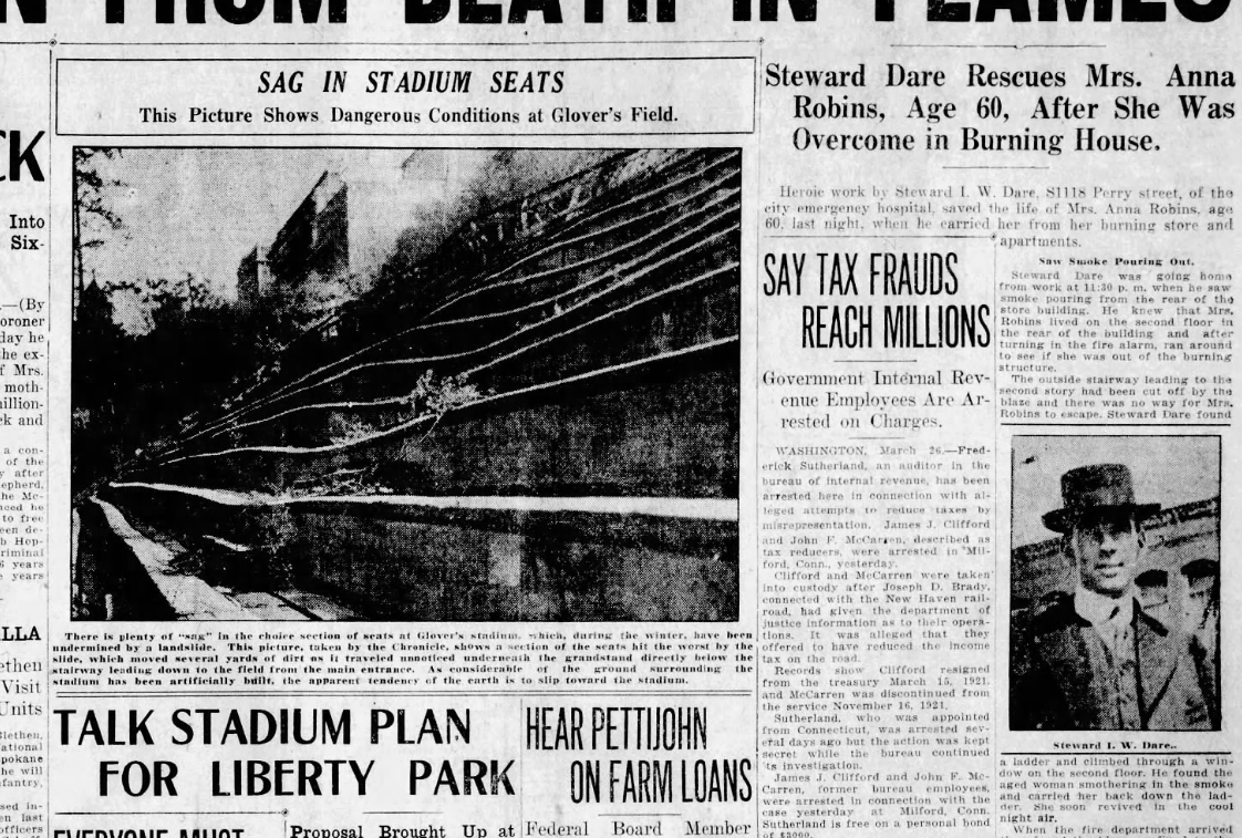 From 1925: Spokane city commissioners were expected to approve an emergency ordinance appropriating funds to repair the bleachers at Glover Field in Spokane.
