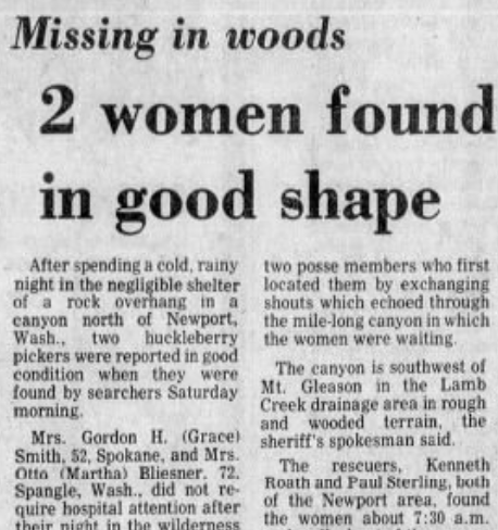 From 1975: Two women huckleberry pickers from Spokane spent a “cold rainy night in the negligible shelter of a rock overhang” north of Newport, but they were found in good shape the next morning.