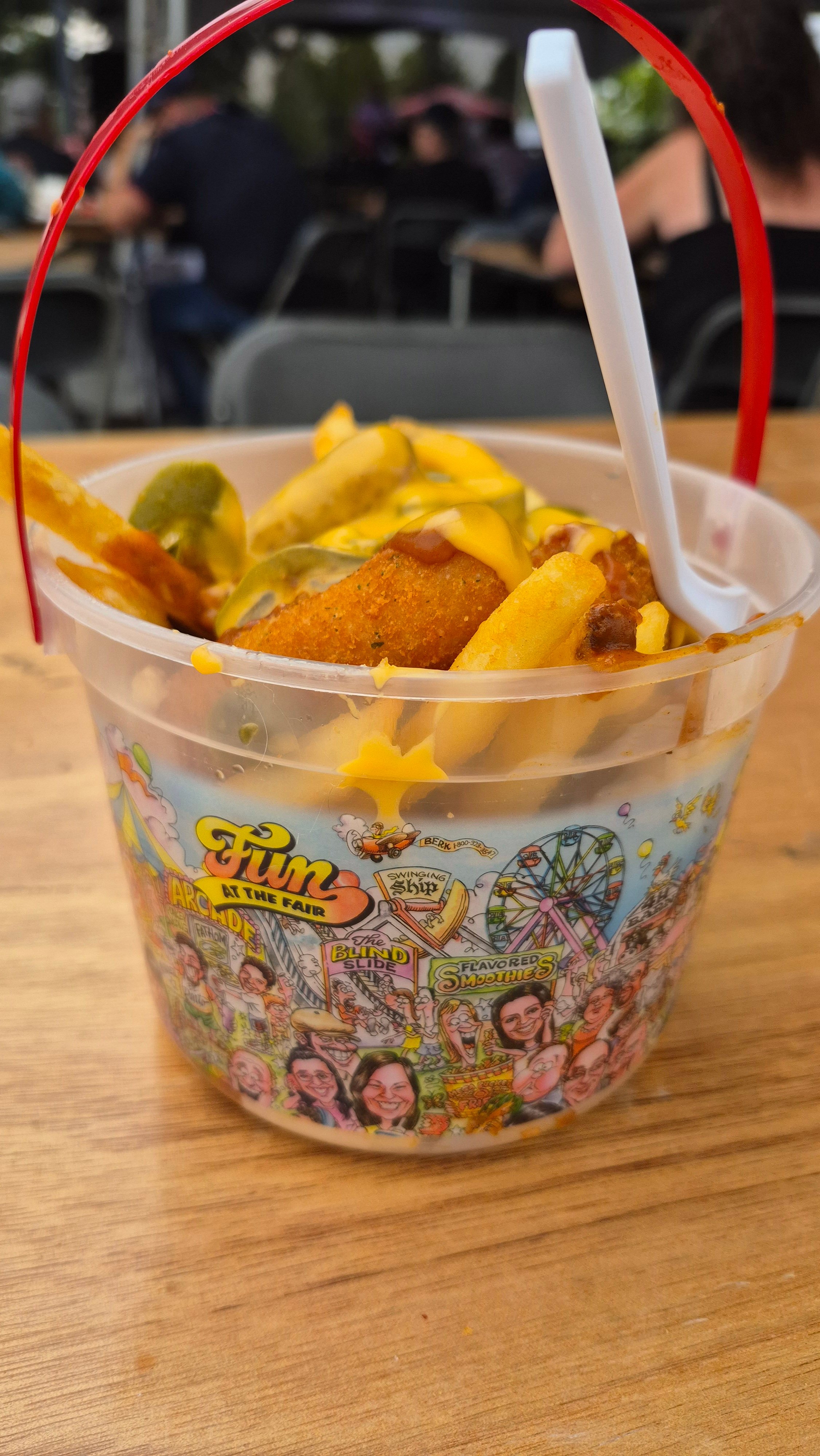If you love traditional fair food and are hard-pressed (pun intended) to decide what kind to get, there’s the Hot Mess: a bucket of fries, fried mozzarella sticks, fried mac and cheese bites, chili, jalapenos and, of course, cheese sauce. But be warned that it’s definitely an item better to share. Otherwise, you’ll have three options: waste your money, eat until you’re uncomfortably full or walk around for the rest of day carrying a half-full “Fun at the Fair” bucket that for some reason features caricatures of Arnold Schwarzenegger, Roseanne Barr and other vaguely famous-looking people.