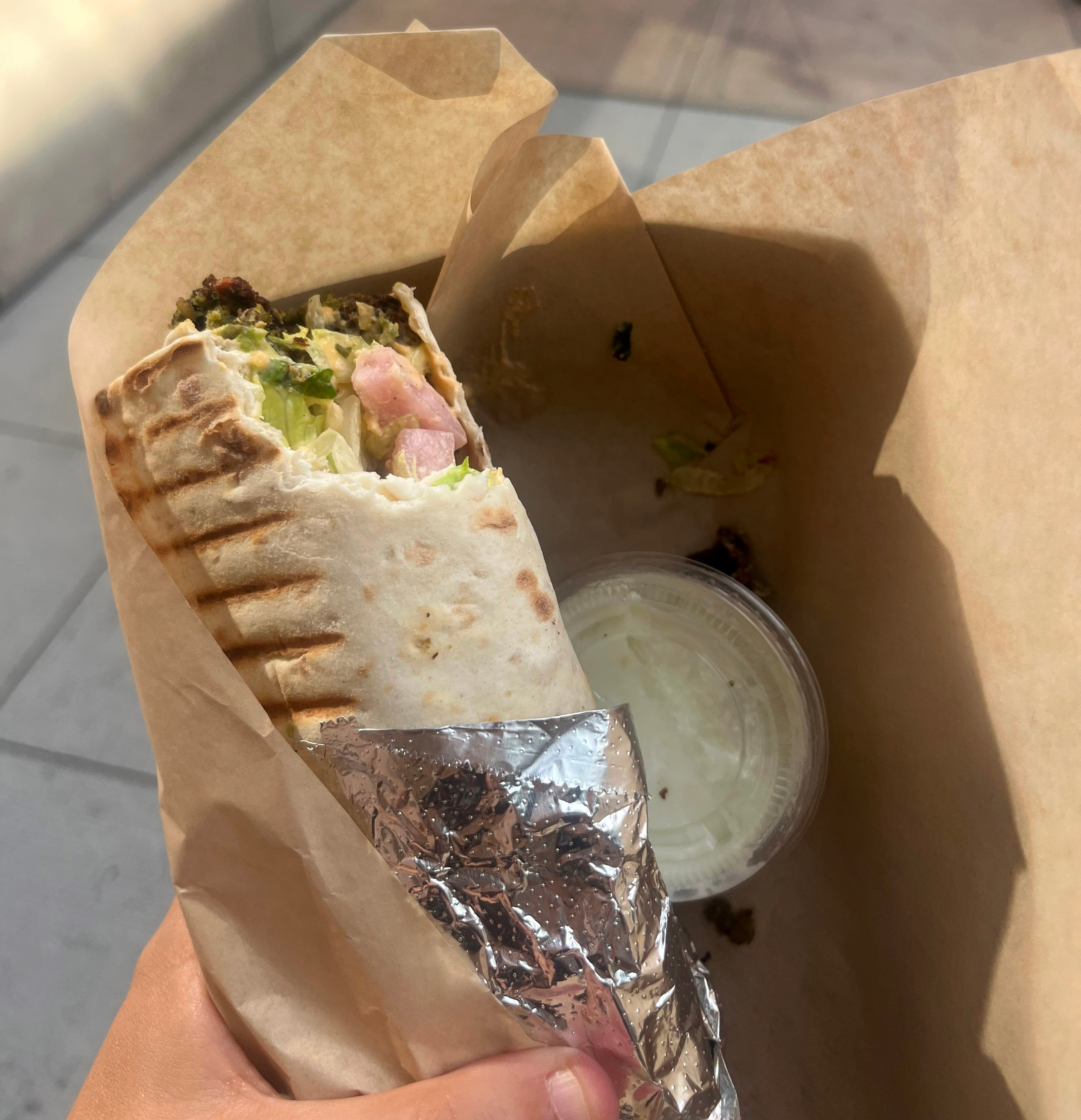 A Falafel wrap offers something few and far between at Pig Out: plenty of veggies. Fresh tomatoes and lettuce complement the warm falafel, further elevated by tangy, vinegary pickled vegetables.