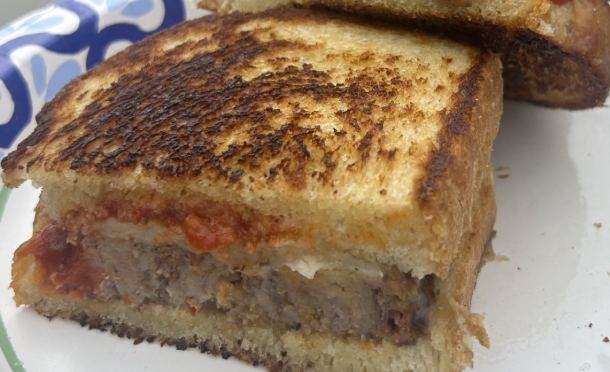 Pressed between two mainstay barbecue offerings, brisket and pulled pork, was a smoked meatloaf sandwich served with Havarti on grilled sourdough bread.