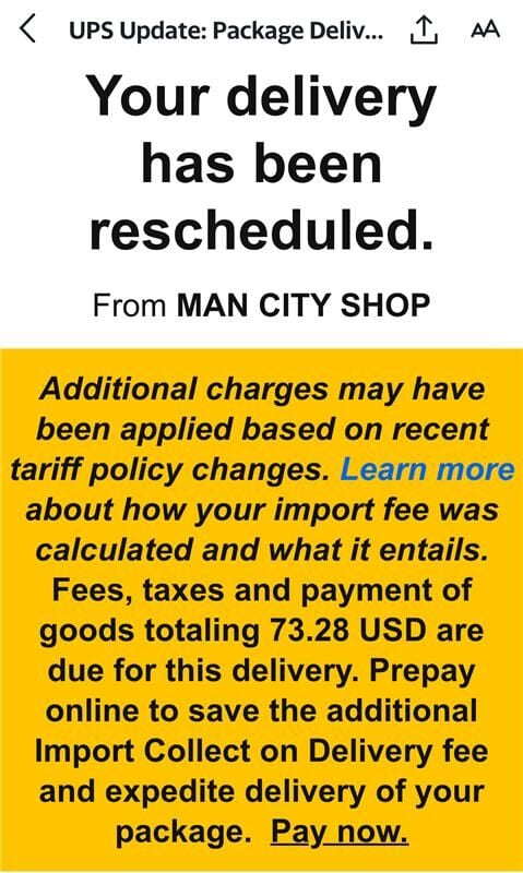 UPS later sent an email notification of “fees, taxes and payment of goods” worth an additional $73.28 still due for the order. The commercial shipper also sent a driver to deliver the notice in person and explain that the delivery would not be completed until the balance was settled.