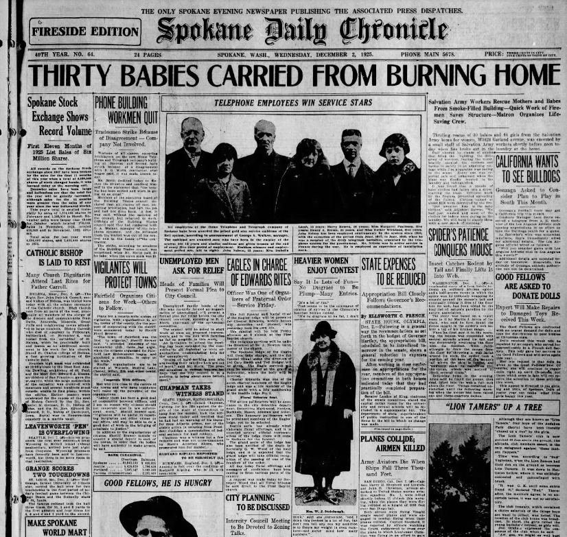 “Half-blinded by clouds of smoke that filled the building, the little army of workers, fearing the worst, carried the mothers and babies to safety in an adjoining cottage,” said the Spokane Chronicle. “Every one was reported safe and unharmed when the blaze was finally located in the laundry and extinguished.”