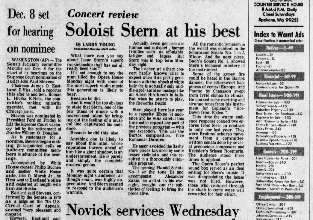 From 1975: World-famous violin virtuoso Isaac Stern “filled the (Spokane) Opera House Monday night with some of the most superb violin music this generation is likely to hear.”