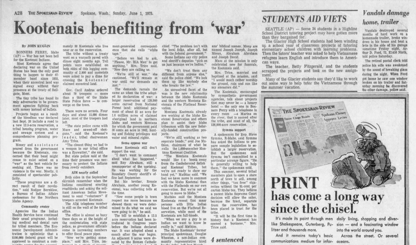 From 1975: Late in 1974, the Kootenai Tribe had “declared war” on the federal government.