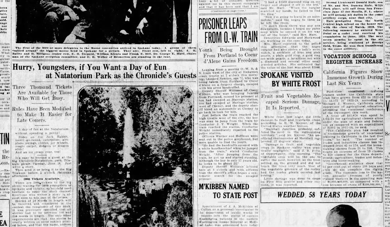 From 1925: A deputy was escorting Leonard Newton, 17, in handcuffs on a train from Portland to Coeur d’Alene, where he was to stand trial on forgery charges.