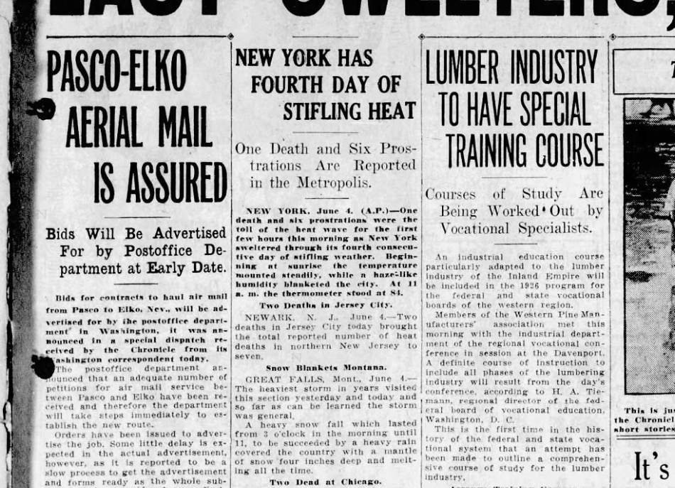 Local authorities had been lobbying for this route for months, since it would cut 48 hours off of East Coast mail delivery to Spokane and Eastern Washington. A westbound plane from New York arrived at Elko every day just after noon.