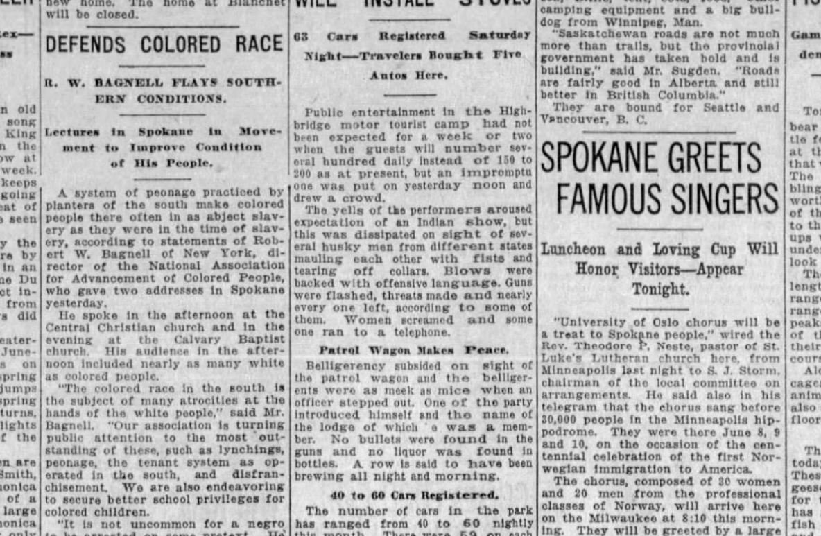 From 1925: The national director of the National Association for the Advancement of Colored People (NAACP) spoke at Spokane’s Central Christian Church and also the Cavalry Baptist Church.