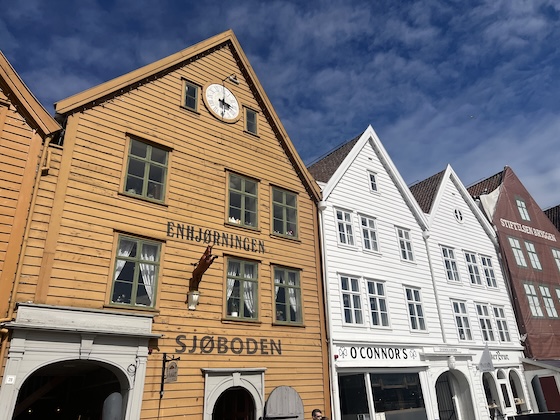 2:45 p.m.: We’re sitting outside Bergen’s Bryggen area, a World Heritage site that dates back to medieval times. It’s set in the city’s harbor district and is said to be “one of North Europe’s oldest port cities on the west coast of Norway which was established as a centre for trade by the 12th century.”