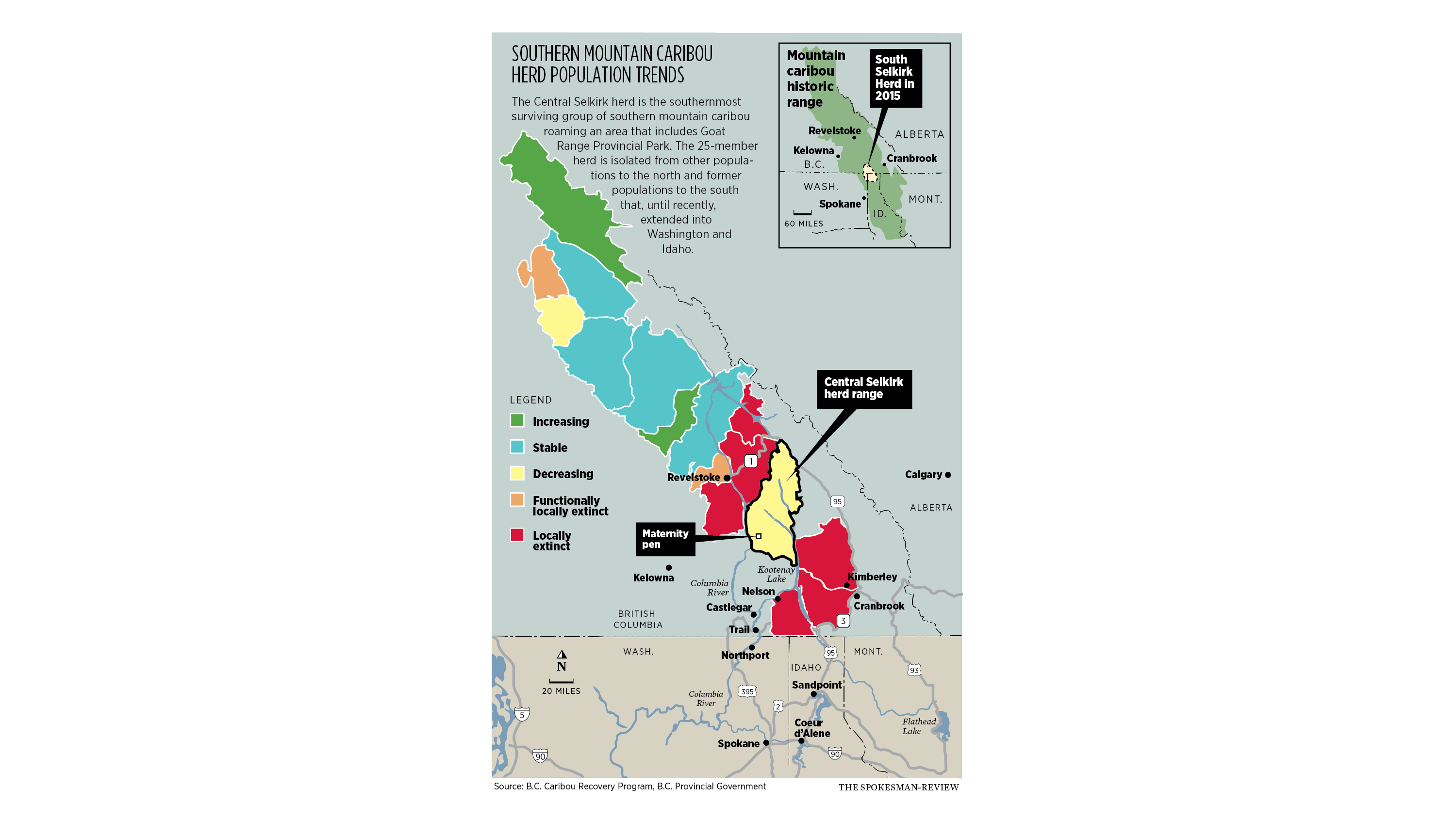 The following year, Canadian officials captured the last surviving member of the South Selkirk herd near Creston, B.C., and moved her farther north to another maternity pen by Revelstoke. The adult female integrated into the Revelstoke herd at least until her radio collar stopped working, Entz said.