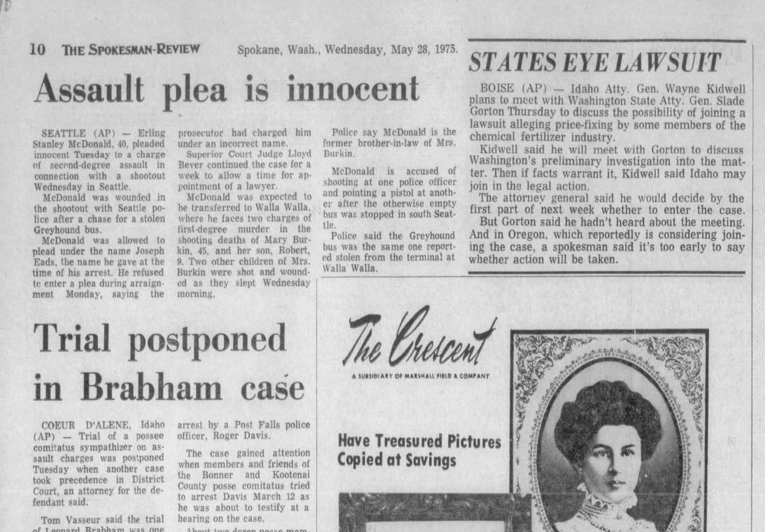Police knew that the bus was stolen from the Walla Walla bus terminal, and that it was seen that night in the vicinity of killings. The man claimed he was Joseph Eads, but police suspected he was actually Erling Stanley McDonald, the brother-in-law of the slain women. She and a son were shot as they slept, and two other children were shot and injured.