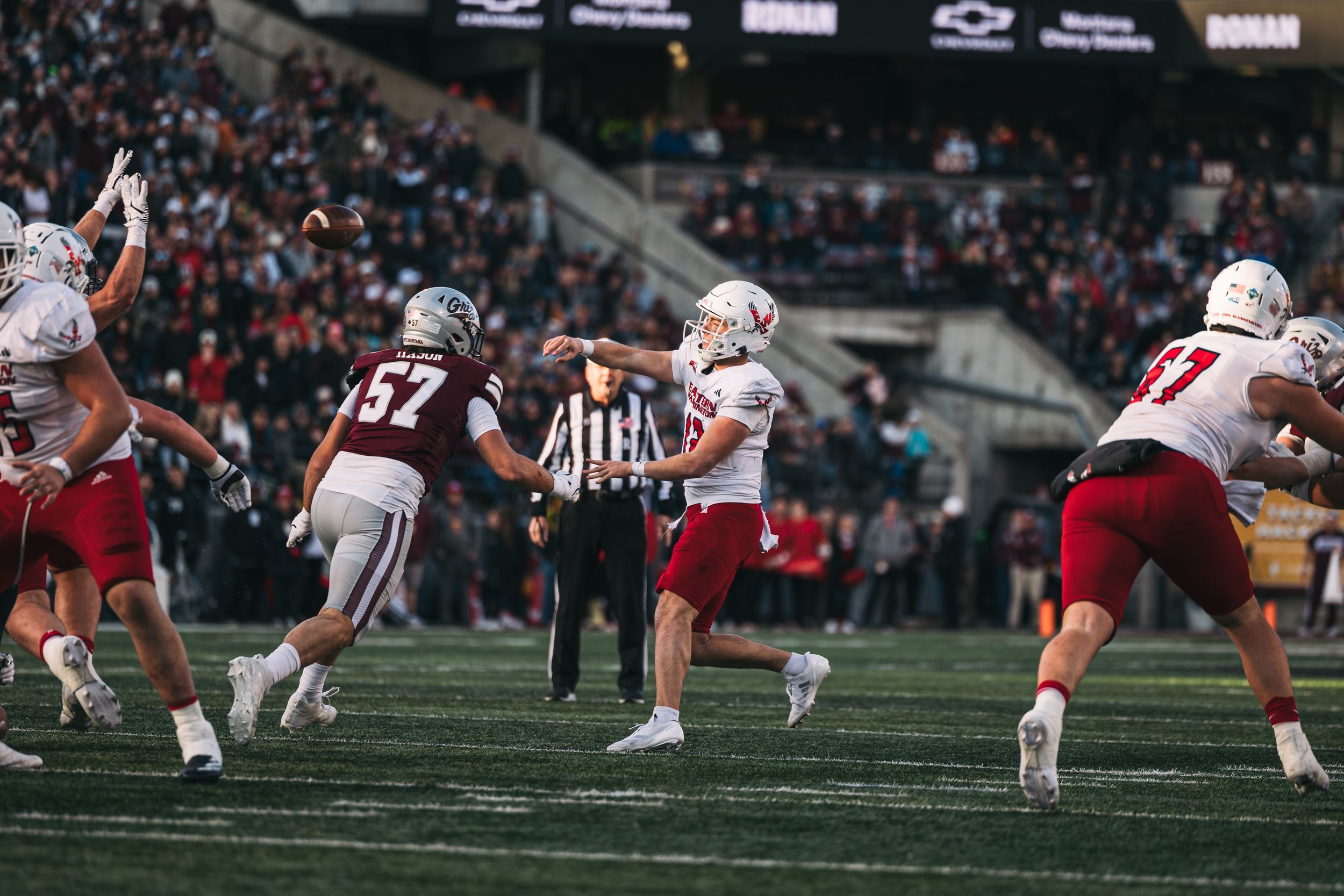 EWU: Playing the No. 2 team in the nation is hard enough. Playing it in its home stadium, where it hardly loses, adds another level. Throw in some cool weather and the usual Missoula atmosphere and Eastern Washington seemed doomed. Except it wasn’t. And, with second left, the Eagles had moved the Montana’s 5-yard line, trailing by five points. That’s when the wet ball, the noise and the weight of it all may have hit first-time starting quarterback Jake Schakel. The redshirt freshman had passed for 451 yards, shredding the Griz like no one has this season. All he needed was to spike the ball and throw for 5 more. Instead, as he tried to do the former, he lost it and the fumble meant he would never have the chance for the latter. Dan Thompson has the whole story of the 29-24 loss in this gamer and this notebook. … The Eagle men’s basketball team has been close three times without winning. Saturday night in Boulder, it took Colorado to overtime, only to fall 102-97. … Elsewhere in the Big Sky, third-ranked Montana State hung a 66-14 loss on visiting Weber State. … Sacramento State rolled over host Portland State. … Northern Arizona had little trouble with Northern Colorado. … Host Idaho State topped Cal Poly 27-17. … Abilene Christian had no trouble with next-year Big Sky member Utah Tech. … Southern Utah evened its record at 5-5 with a 27-17 win over host Eastern Kentucky. … In basketball news, the Thunderbird men weren’t as successful, losing a home game to UT Rio Grande Valley. … The Montana State women rolled at Portland. … Idaho State did the same at home.
