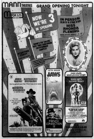 How could a theater built in 1931 hold a grand opening in 1975? Because it was the grand opening of its new incarnation as a triplex. A full-page ad featured a cartoon of a stork, carrying a bundle with a sign reading “Now We’re 3 in Spokane.”